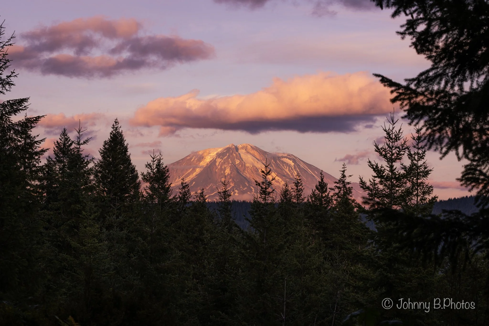 A campsite with a clear cut opening and when the sun hit Mt St Helen’s at just the right time, it lit up with so much color!